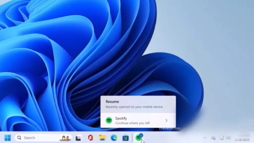 例えばWindowsでSpotifyのタスクバーにカーソルを合わせると、その横に電話のアイコンが表示されるようになります。そしてアイコンにカーソルを合わせると、現在スマートフォンで聞いていた内容が表示され、アイコンをクリックすると携帯電話のアプリと同じ画面に移動するというものです。