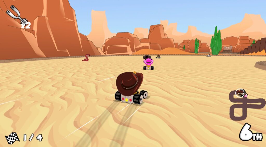 さあ、さあ行こう、カウボーイカートレースの準備をしろ!これは西部開拓時代の昔ながらのレースだ。ホースシューを投げ、カウパイを落とし、TNTを投げ入れるこの90年代の狡猾でワイルドなゲームで......1890年代の話だ......最大4人まで分割画面で対応できる。