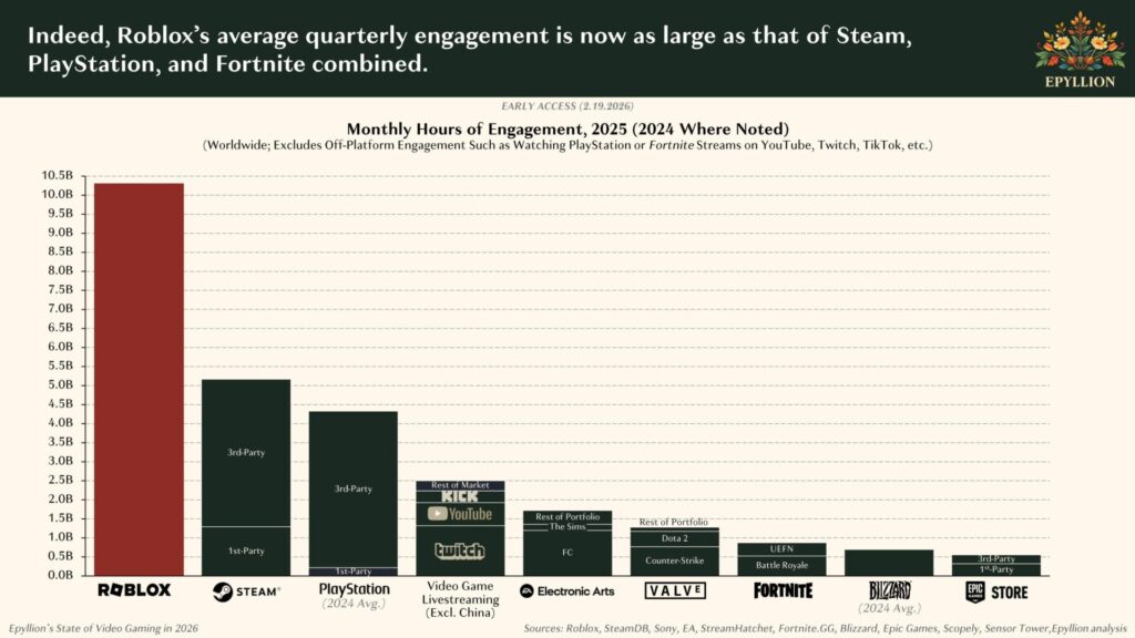 報告に寄れば、2025年のゲーム業界全体の成長の67%はRobloxのものであるとのこと。月間アクティブエンゲージメントはSteam、PlayStation、Fortniteの合計よりも多く、その殆どがスマートフォンからのプレイヤーとなっています。